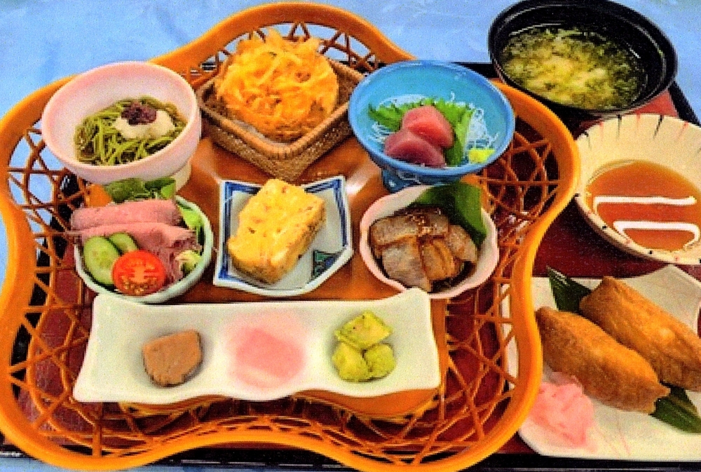 前菜三種、ローストビーフ、玉子焼き、若鶏の黒酢和え、茶そば、かき揚げ、お刺身、いなり寿司、漬物、汁物が付いた、少しずついろいろ楽しめる贅沢な御膳です。