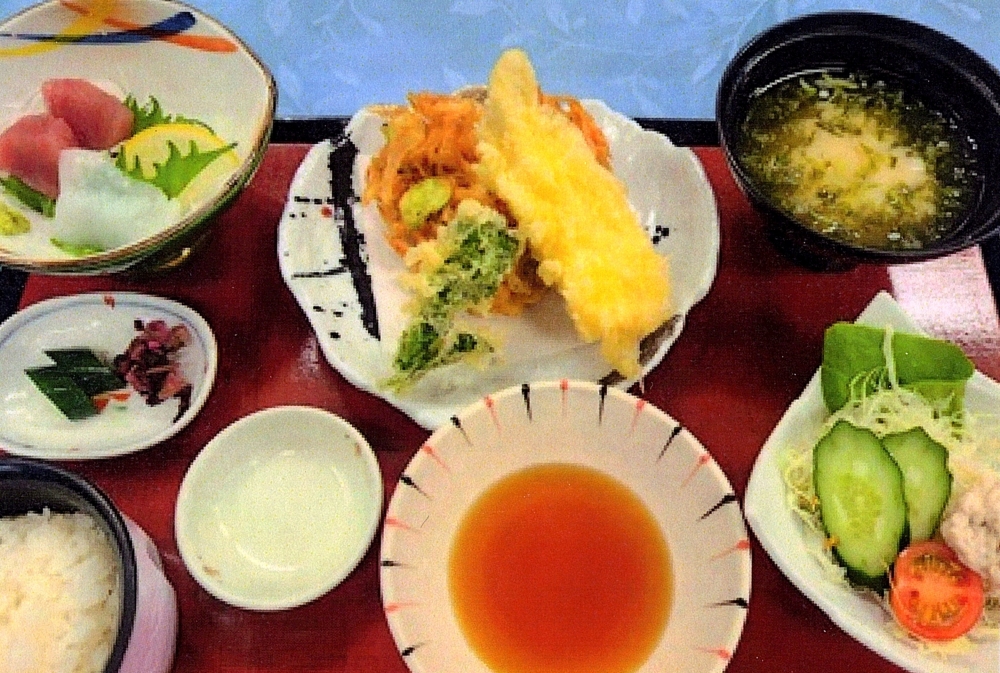 桜エビとそら豆のかき揚げ、真鯛の天ぷら、季節の野菜の天ぷらを盛り合わせた、春の味覚を楽しめる御膳です。お刺身とサラダ付。